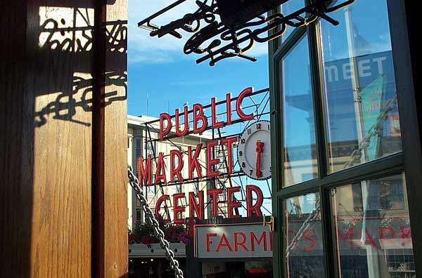 A picture of the famous Pike Place Public Market sign from inside a bar in Seattle